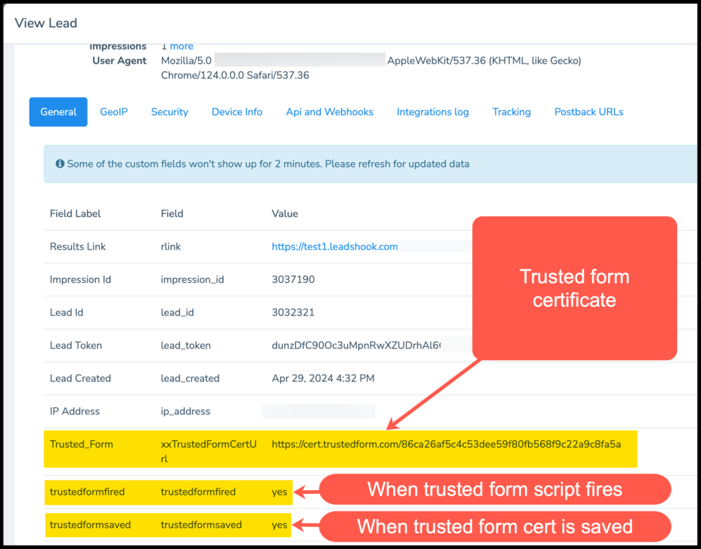 3. Text field called “trustedformsaved“. This is an optional field which is updated once the script that saves your Trusted Form Certificate is saved.
